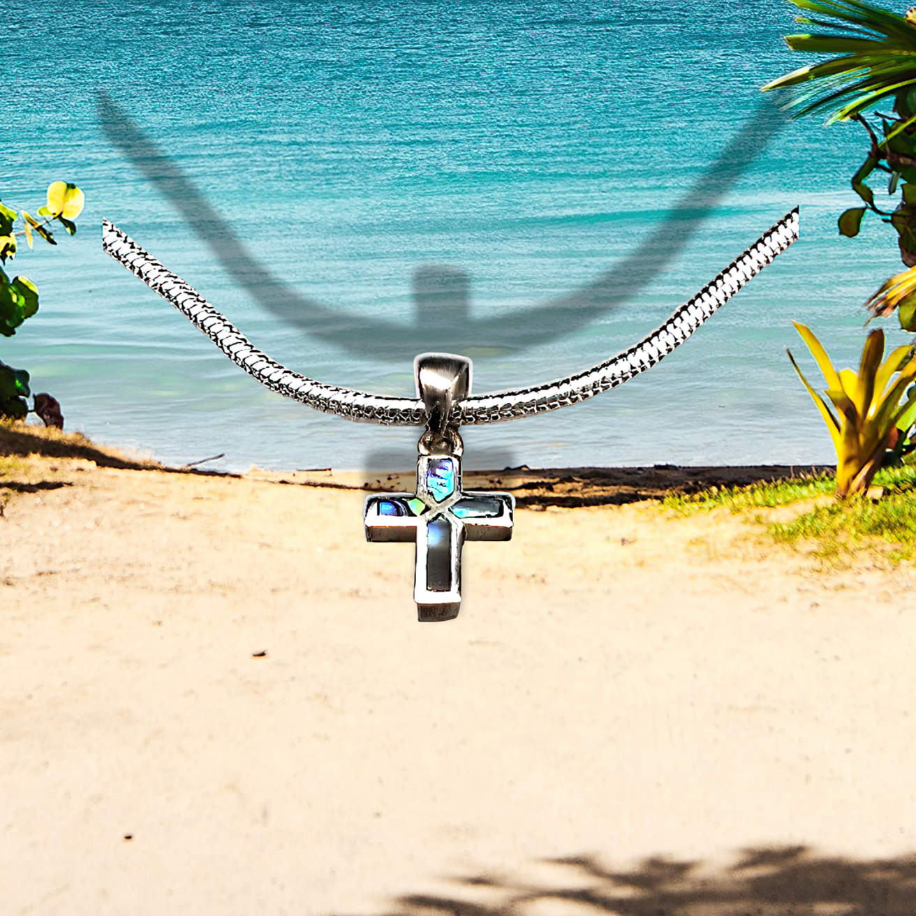 Abalone Cross on a .925 sterling silver plated snake chain with ".925" tag